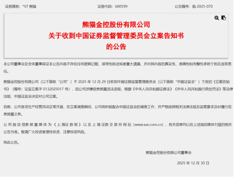 12月29日晚间,*ST熊猫发布公告披露,该公司于2025年12月29日收到中国证券监督管理委员会下发的《立案告知书》,因公司涉嫌信息披露违法违规,根据《中华人民共和国证券法》《中华人民共和国行政处罚法》等法律法规,中国证监会决定对公司立案。