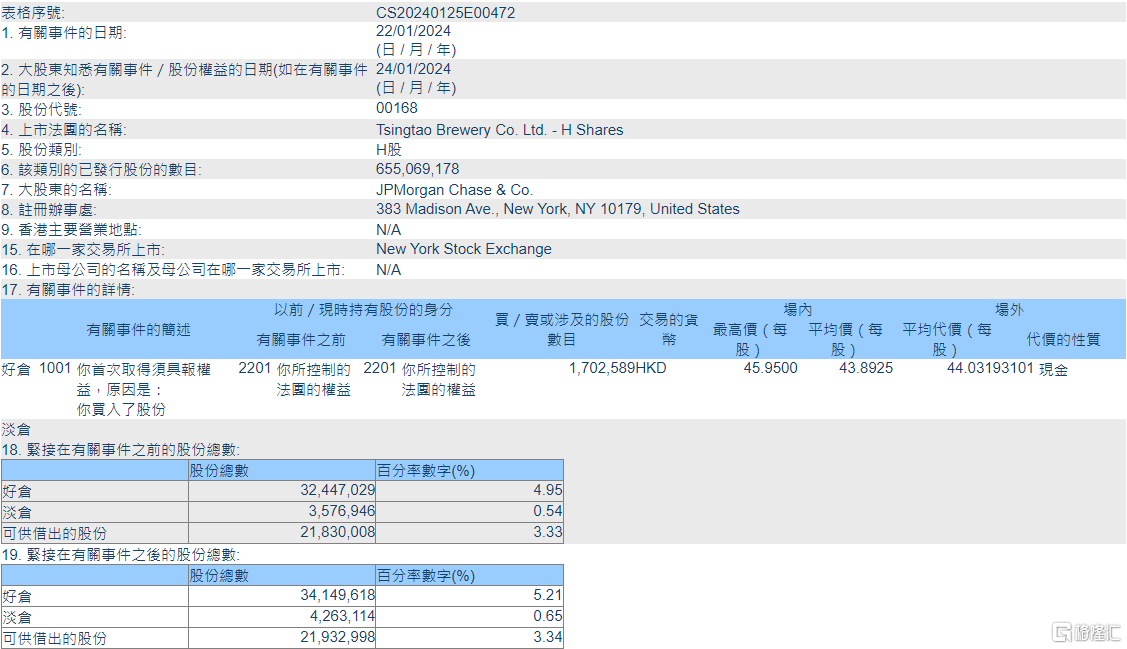 格隆汇1月29日丨根据联交所最新权益披露资料显示,2024年1月22日,青岛啤酒股份(00168.HK)获JPMorgan Chase & Co.以每股均价43.8925港元增持好仓170.26万股,涉资约7473.1万港元。