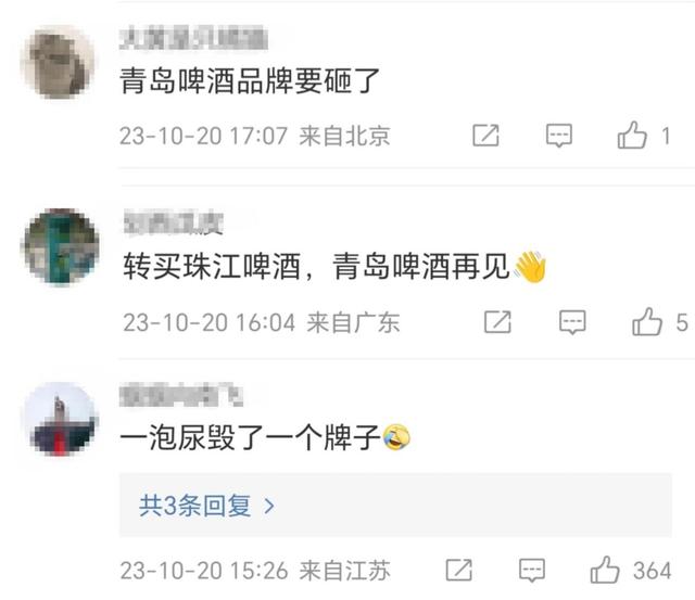 该事件引发了消费者和投资者的强烈不满和信任危机,网友纷纷表示“一泡尿毁了一个牌子”“转买珠江啤酒,青岛啤酒再见”“青岛啤酒品牌要砸了”......