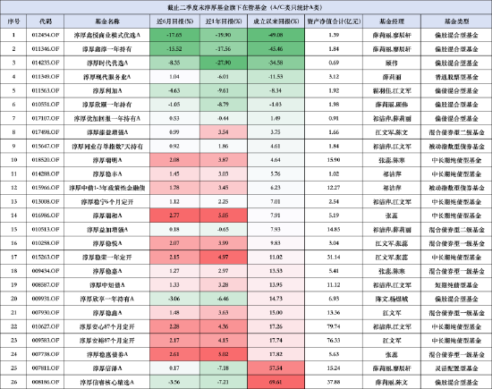 具体看淳厚基金旗下基金产品(A/C类只统计A类),在26只产品中,有6只产品成立以来回报为负。其中,淳厚鑫悦商业模式优选A成立以来回报接近“腰斩”,为-49.08%。淳厚鑫淳一年持有成立以来回报为-45.46%,淳厚时代优选A成立以来回报为-34.58%。值得一提的是,上述三只产品皆为偏股混合型基金,而淳厚鑫悦商业模式优选A、淳厚鑫淳一年持有皆由薛莉丽、廖辰轩共同管理。