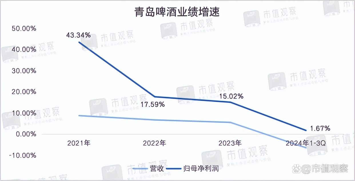2021-2023年,青岛啤酒的营收增速从8.67%到6.65%,再到5.49%,归母净利润增速从43.34%到17.59%,再到15.02%,呈逐年放缓趋势。