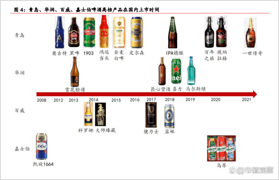 实际上,青岛啤酒先知先觉,早于2012年便感知潮水的方向,陆续推出了奥古特、鸿运当头、1903、全麦白啤、琥珀拉格等中高档产品,后又在2022年以一世传奇加码超高端市场。