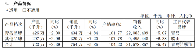 具体而言,2024年青岛品牌产品销量同比下滑4.84%,销售收入同比下滑5.07%;以崂山啤酒为代表的其他品牌产品2024年销量同比下滑7.2%,销售收入同比下滑6.38%。