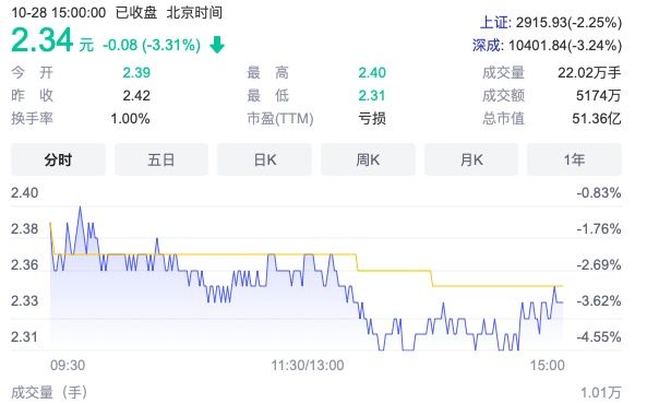 ▲*ST方科28日收报2.34元/股,总市值跌至51.36亿元。