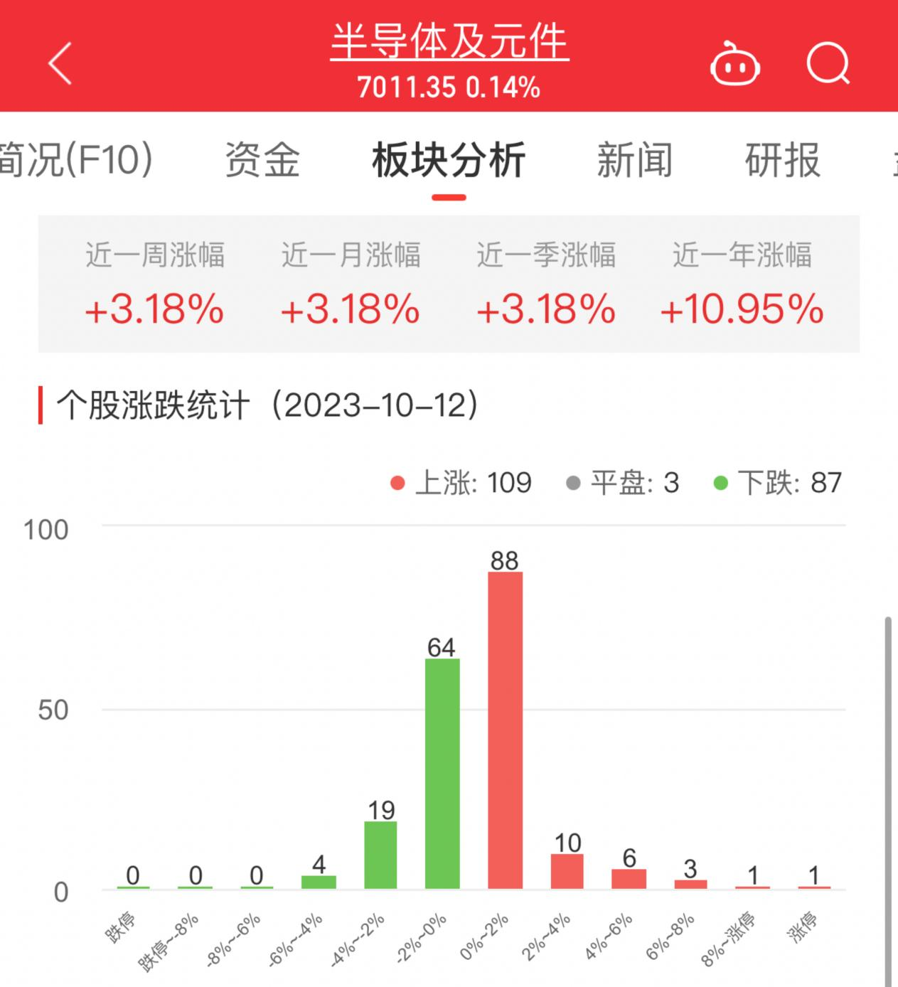 今日,半导体及元件板块整体涨幅0.14%,其中109只股票上涨,3只股票平盘,87只股票下跌。