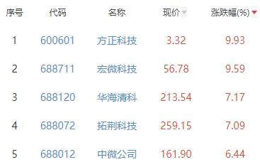 其中,方正科技、宏微科技、华海清科、拓荆科技、中微公司位列板块涨幅前五位,涨幅分别为9.93%、9.59%、7.17%、7.09%、6.44%。