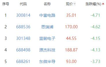 中富电路、思瑞浦、蓝箭电子、源杰科技、东微半导位列涨幅榜后五位,涨幅分别为-4.71%、-4.62%、-4.15%、-4.13%、-3.73%。