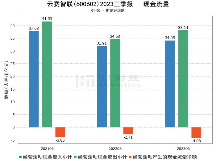 在现金流量方面,云赛智联2023年三季度经营活动现金流入小计为34.05亿元,较上年同期的31.91亿元有所增长,显示公司的经营活动现金流入在增加。经营活动现金流出小计为38.14亿元,较上年同期的34.63亿元有所增长,这表明公司的经营活动现金流出在增加。