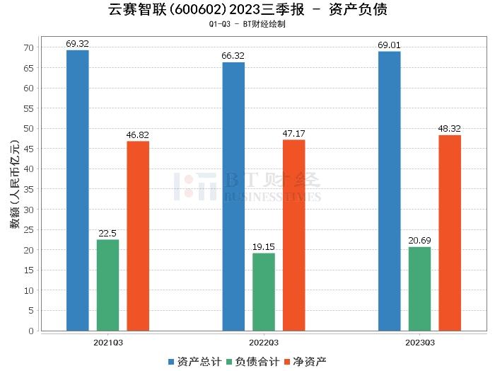 从资产负债方面看,云赛智联2023年三季度的总资产为69.01亿元,相比上年度末的72.31亿元有所下降。负债合计为20.69亿元,较上年度末的24.99亿元减少,这表明公司的负债负担有所减轻。净资产为48.32亿元,较上年度末的47.33亿元有所增长,显示公司的净资产规模在扩大。资产负债率为29.98%,较上年度末的34.56%有所下降,这表明公司的财务结构更为稳健。