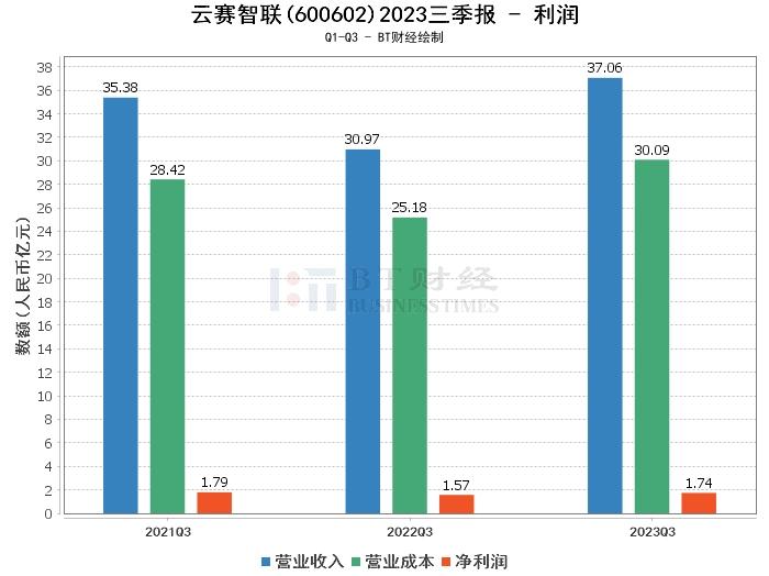 在利润方面,云赛智联2023年三季度的营业收入为37.06亿元,较上年同期的30.97亿元有所增长,显示公司的营业规模在扩大。营业利润为1.95亿元,较上年同期的1.83亿元有所增长,这表明公司的盈利能力有所提升。净利润为1.74亿元,较上年同期的1.57亿元有所增长,显示公司的净利润水平在提升。