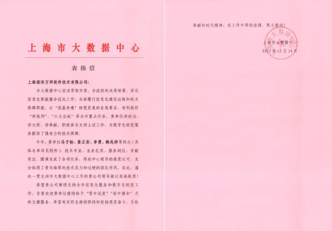 日前,云赛智联旗下上海南洋万邦软件技术有限公司收到了上海市大数据中心发来的表扬信,对南洋万邦市大数据中心服务团队提出表扬,并向一贯支持市大数据中心工作的上海仪电、云赛智联、南洋万邦致以崇高的敬意。