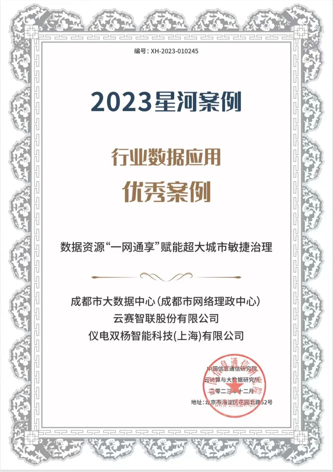 该项目是继2023年10月获得由DAMA中国颁发的“2023 DAMA数据治理最佳实践奖”之后的再次获奖;云赛智联联合浦东大数据中心参选项目在2022年获得第六届大数据“星河(Galaxy)”案例标杆案例之后,再次联合西部中心城市成都获得第七届大数据“星河(Galaxy)”案例优秀案例;是业内权威机构对云赛智联在政府数字化转型领域的持续肯定与认可。