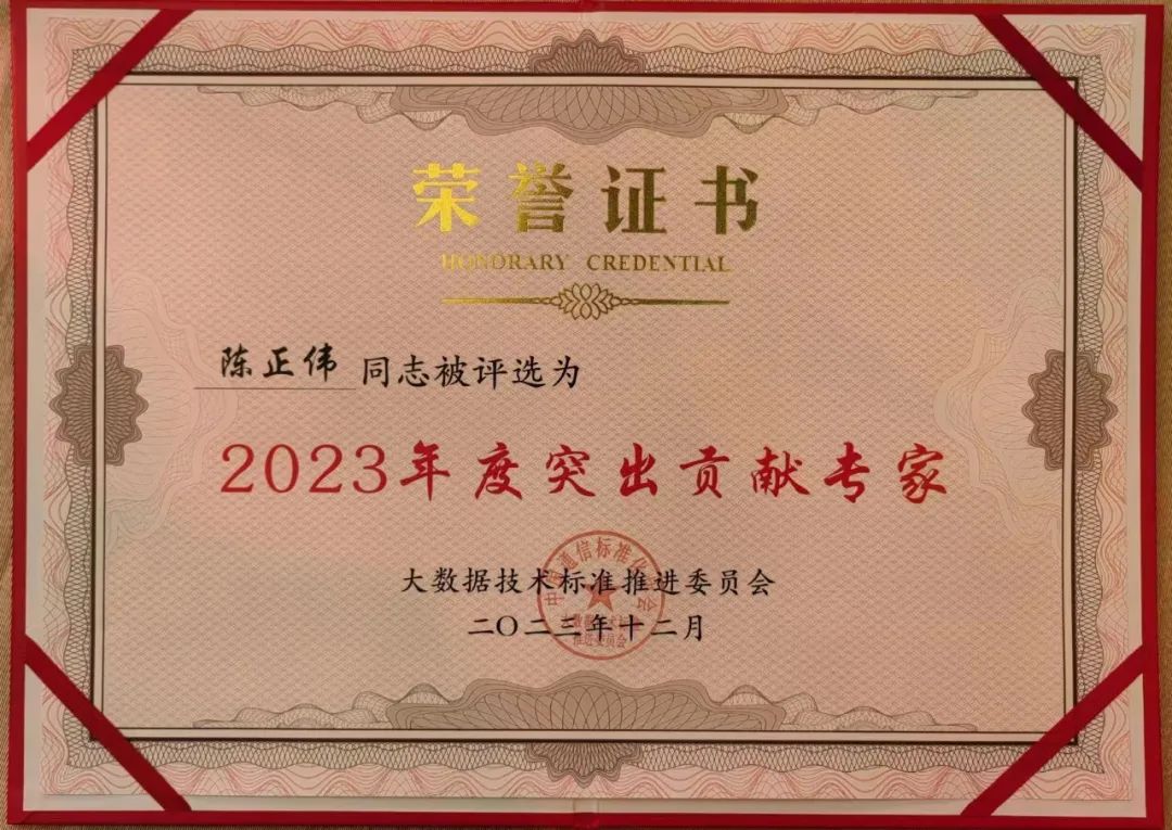陈正伟先生因带领团队深度参与中国通信标准化协会大数据技术标准推进委员会多个标准和白皮书的编制工作,获得“2023年度突出贡献专家”奖项。
