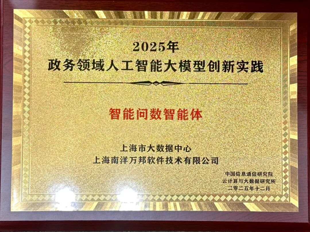 2026年1月6日,由中国信息通信研究院、中国通信标准化协会主办,数字政府建设赋能计划承办的政府数智化转型成果发布会在北京成功举办。云赛智联旗下企业上海南洋万邦软件技术有限公司凭借为上海市大数据中心实施的“智能问数智能体”,成功入选《2025年政务领域人工智能大模型创新实践》案例。