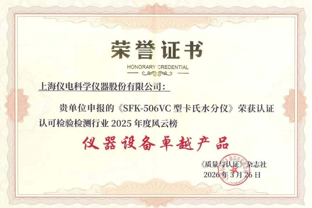 2026年3月26日,由《质量与认证》杂志社主办的2026认证认可检验检测行业高质量发展年会在北京隆重召开。云赛智联旗下企业上海仪电科学仪器股份有限公司凭借自主研发的雷磁SFK-506VC型卡氏水分仪荣获“认证认可检验检测行业2025年度风云榜·仪器设备卓越产品”奖项,彰显了企业在水分检测领域的持续技术积累与产品创新能力。