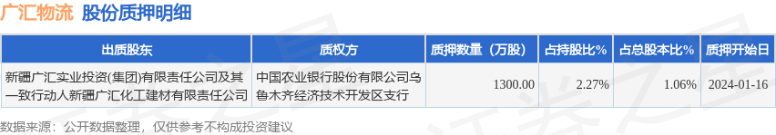广汇物流(600603)1月18日公开信息显示,股东新疆广汇实业投资(集团)有限责任公司及其一致行动人新疆广汇化工建材有限责任公司向中国农业银行股份有限公司乌鲁木齐经济技术开发区支行合计质押1300.0万股,占总股本1.06%。质押详情见下表: