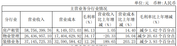 毛利率降低的同时,业务运营成本却在增加。2023年,公司房产租赁业务的营业成本同比增加14.40%,物业管理业务营业成本同比增加16.04%,装修业务的营业成本更是同比增加189.65%。