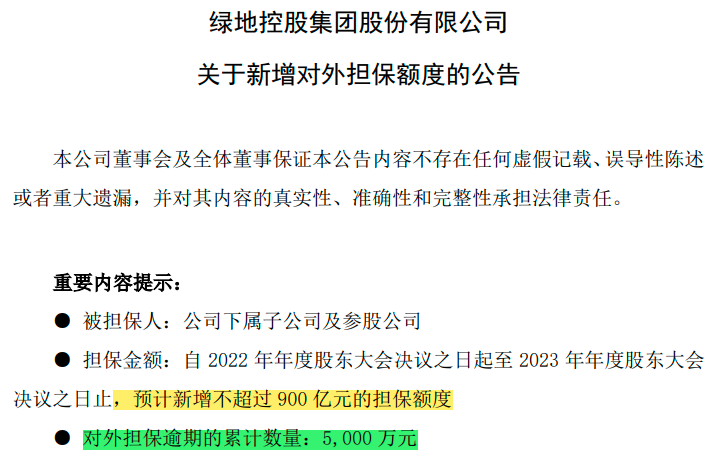 但今年4月,绿地控股发布的新增对外担保额度公告中称,自2022年年度股东大会决议之日起至2023年年度股东大会决议之日止,预计新增不超过900亿元的担保额度,而已有5000万元对外担保逾期。