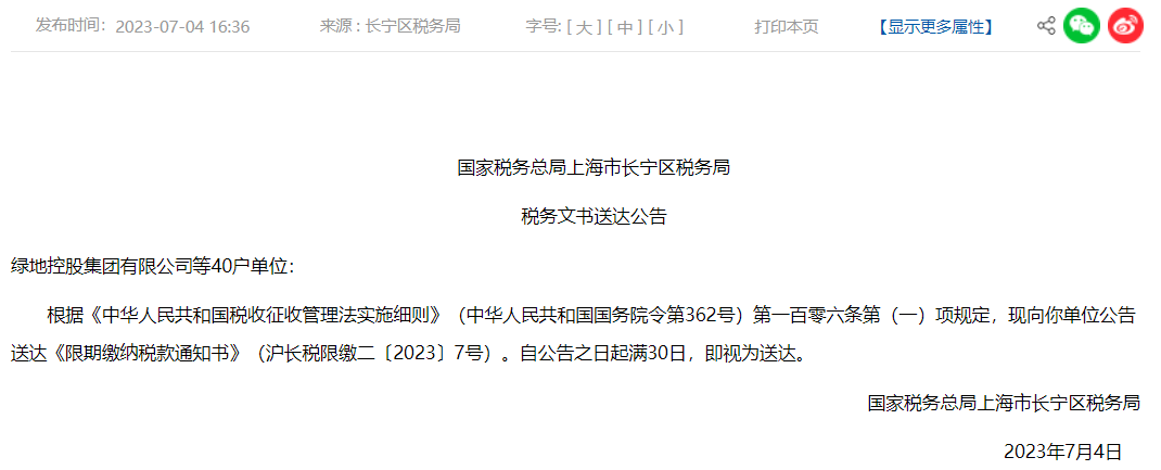 据相关限期缴纳税款通知书要求,绿地控股集团应在今年8月7日前缴纳应缴纳的税款,附加费以及相应的滞纳金。