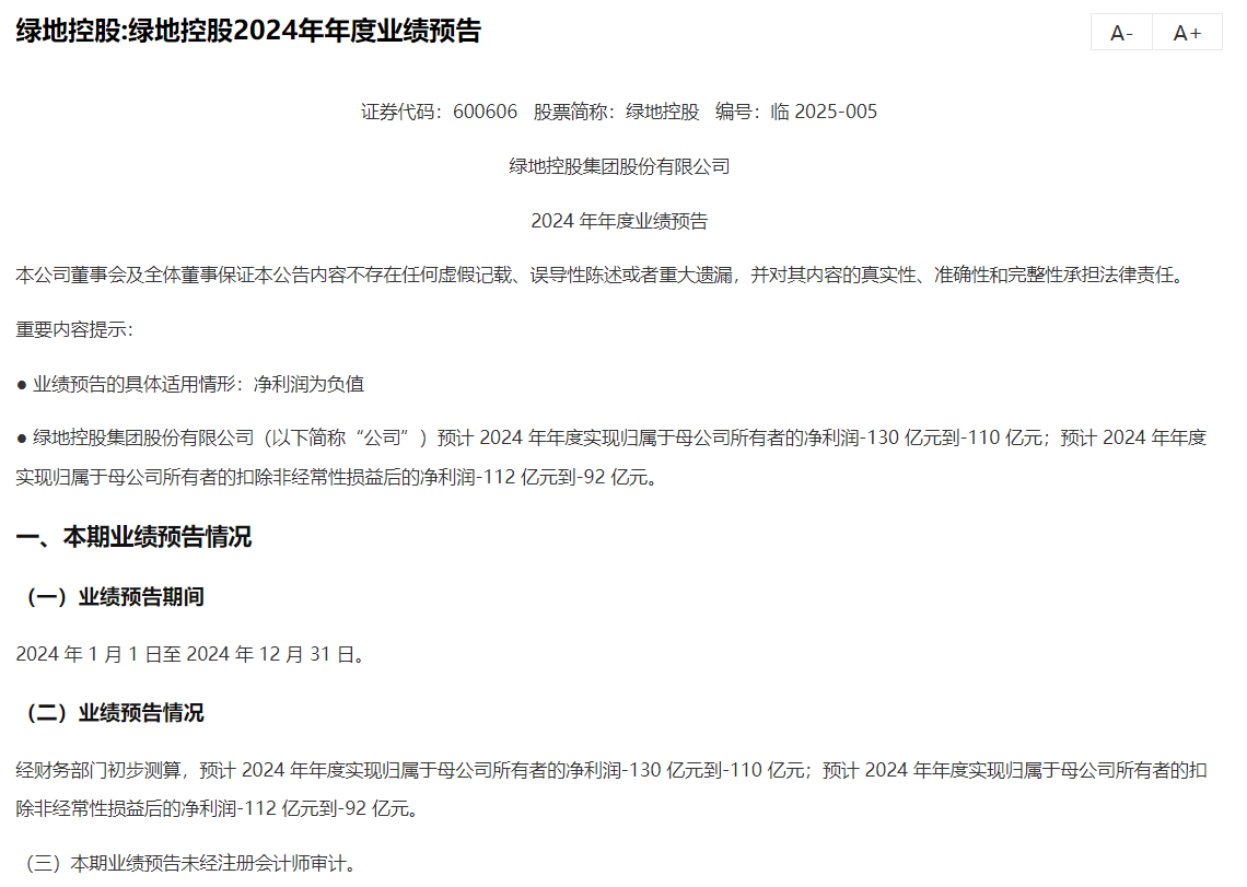 绿地控股发布的2024年业绩预告显示,预计2024年年度实现归属于母公司所有者的净利润-130亿元到-110亿元;预计2024年年度实现归属于母公司所有者的扣除非经常性损益后的净利润-112亿元到-92亿元。