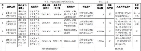 华晨集团于2019年9月9日出具了《华晨集团关于金杯汽车为沈阳金杯车辆制造有限公司和沈阳金杯汽车模具制造有限公司担保处理安排相关事项的承诺函》(以下简称“承诺函”)。承诺函载明,金杯汽车为沈阳金杯汽车模具制造有限公司(以下简称“金杯模具”)、沈阳金杯车辆制造有限公司(以下简称“金杯车辆”)提供的担保,将由华晨集团在2020年12月31日前平稳、有效解除。