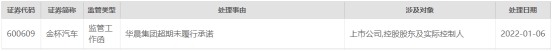上交所网站昨日下发对金杯汽车(600609.SH)的监管工作函,处理事由为华晨集团超期未履行承诺,涉及对象为上市公司,控股股东及实际控制人。