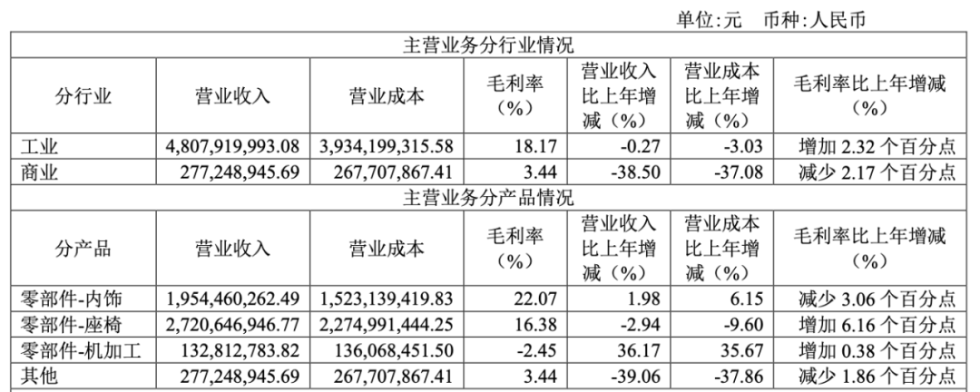 分行业来看,归属于工业和商业等不同行业的产品,其营业成本均有下降。分产品来看,零部件-座椅的营业成本较去年同期下降了9.6%,其他产品的营业成本较去年同期下降了37.86%。