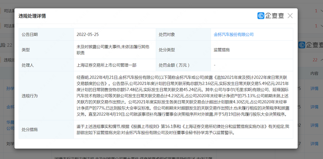 值得一提的是,金杯汽车曾在2022年5月被上海证券交易所予以监管警示。其原因为未及时披露公司重大事件,未依法履行其他职责。