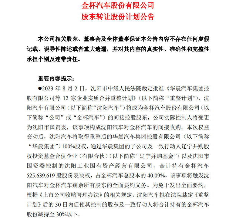 本次权益变动后,沈阳汽车将取得重整后的华晨汽车集团控股有限公司100%股权,通过华晨集团的子公司及一致行动人辽宁并购股权投资基金合伙企业以及沈阳市国资委控制的沈阳工业国有资产经营有限公司,合计持有5.25亿股股份表决权,占金杯汽车总股本的40.09%,该事项将触发沈阳汽车对金杯汽车剩余所有股东的全面要约义务。