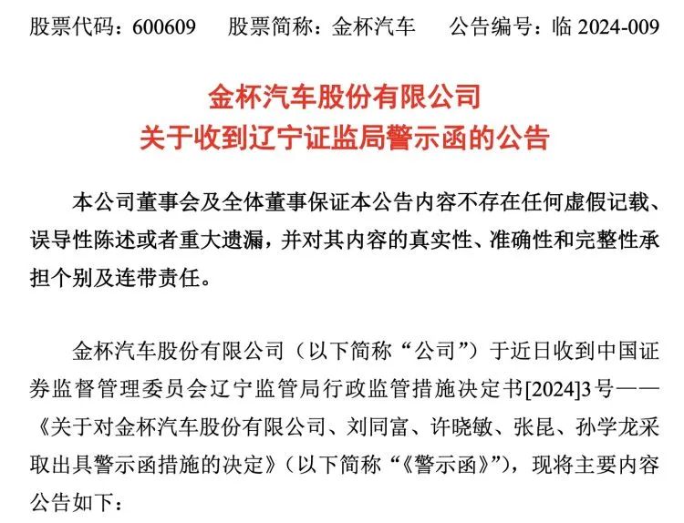 3月29日晚间,金杯汽车公告,公司于近日收到辽宁证监局警示函。