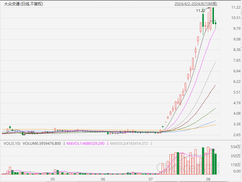 不过,从今年7月8日开始,大众交通的股价突然开始一路狂飙,走出15天9板,在截至月底的18个交易日内,股价从2.95元一度涨至11.19元,涨幅超过270%。8月5日,大众交通再度涨停并创出11.22元的阶段新高,然而次日却又立即跌停,目前仍处于高位横盘震荡状态。