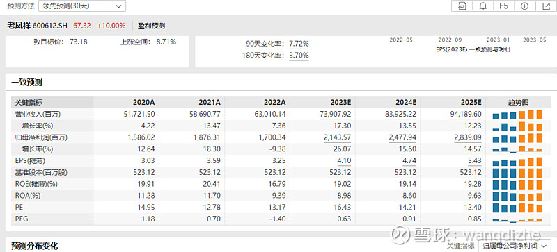 老凤祥2023年的目标是,总营收665亿元,打算同比增长5.54%,而利润总额计划完成32亿元,计划同比提升5.7%,归母净利润18亿元,计划同比提升5.83%。。。。券商的业绩预测显然认为老凤祥自己太低调了,所以wind系统给出的业绩指引明显强于这个预定目标。。。