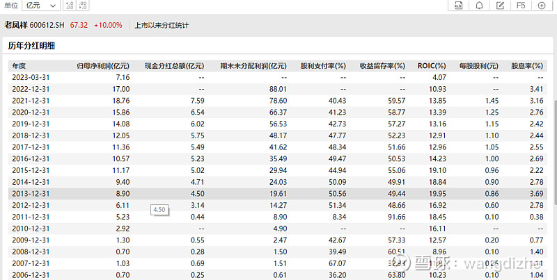 老凤祥共有门店5609家,总营收630.1亿元,同比增速7.26%,归母净利17亿元,同比下降9.38%,分红每股1.45元,这个数据其实3季报之后,我自己评估过,大概是1.43元,所以差距不大。。