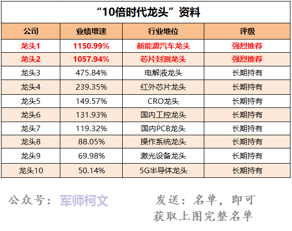 十倍股,就是涨到你当初买入价格十倍的大牛股,把一万变成十万,一百万变成一千万,一千万成变成一个亿。换句话说,就是如果你能在每个十年周期都找到一只十倍股,只需要一万本金、三个周期就能成为亿万富翁!柯文基于基本面和技术面的逻辑,为大家精心筛选了十年十倍股的备选股票池,并进行长期跟踪!