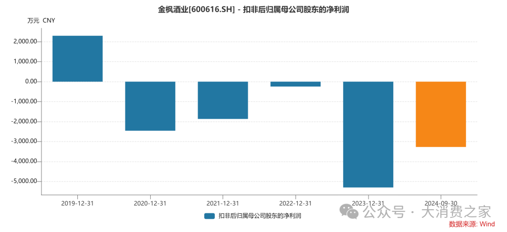特别值得注意的是,金枫酒业近年来在盈利方面表现不佳,已连续四年出现扣除非经常性损益后归属母公司股东的净利润亏损的情况。具体而言,2020年扣非后归属母公司股东的净利润亏损2456万元,2021年亏损缩减至1866万元,2022年亏损再次减少至244.42万元,而到2023年亏损额激增至5297万元。
