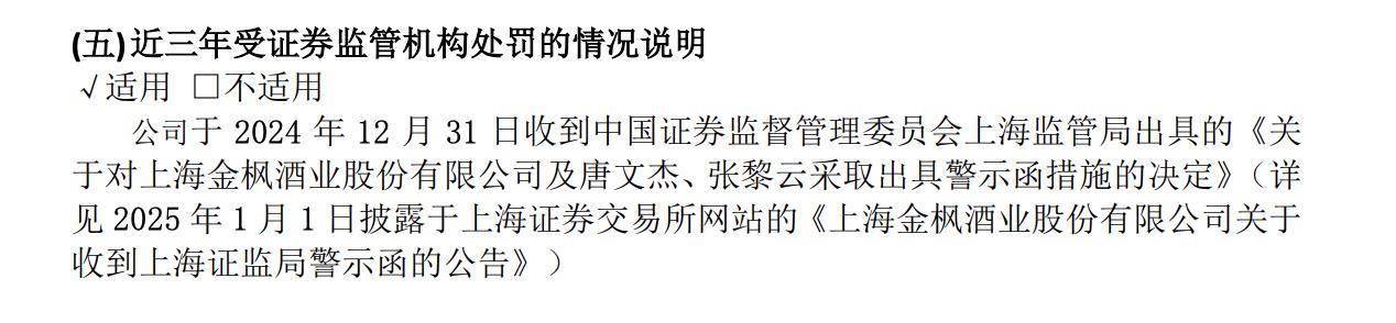 此次监管处罚主要针对的是金枫酒业时任董事长、总经理唐文杰(任期2021年1月至2024年3月)和董事会秘书张黎云(任期自2002年5月至今)。他们因对上述违规行为负有主要责任而被上海监管局采取出具警示函的监管措施。