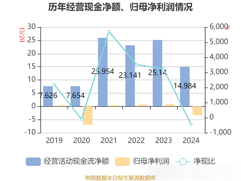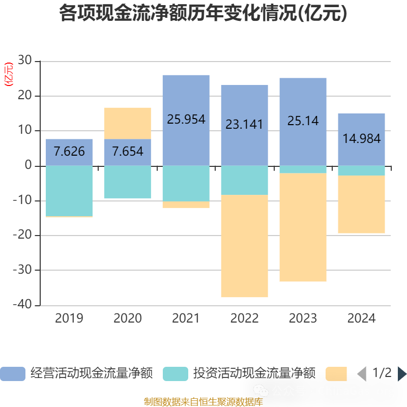 截至2024年,公司经营活动现金流净额为14.98亿元,同比下降40.4%;筹资活动现金流净额-16.52亿元,同比增加14.5亿元;投资活动现金流净额-2.83亿元,上年同期为-2.17亿元。