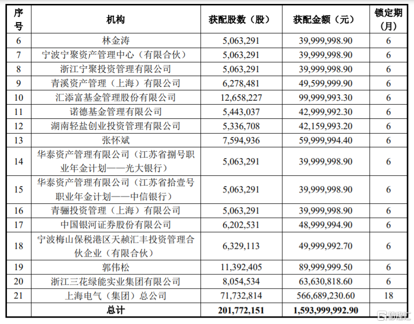 格隆汇7月22日丨海立股份(600619.SH)公布非公开发行股票发行情况报告书,确定此次非公开发行股票的发行价格为7.90元/股,发行股份数量2.02亿股,募集资金总额15.94亿元。此次发行对象最终确定为21家,最终配售情况如下: