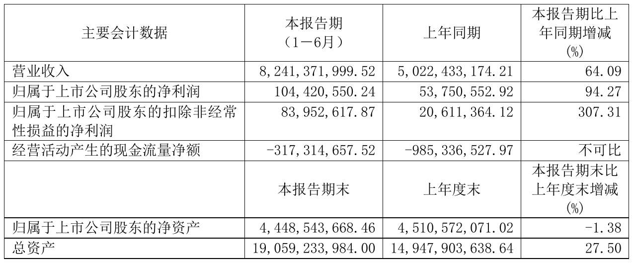 8月30日,海立股份(600619)近日发布2021年半年度报告,报告期内营业收入8,241,371,999.52元,同比增加64.09%;净利104,420,550.24元,同比净利增加94.27%。