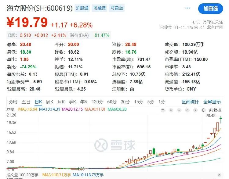 11月11日,海立股份盘中录得涨停板,股价达到近期高点20.48元/股,最终收涨6.28%,报19.79元/股。此前,海立股份已录得五连板。