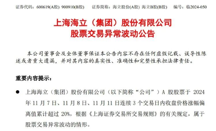 11月11日,海立股份公告,公司A股股票连续3个交易日内收盘价格涨幅偏离值累计超过20%,属于股票交易异常波动的情形。
