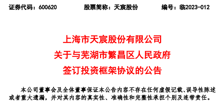天宸股份(600620)于5月4日发布晚间公告称,上海市天宸股份有限公司与芜湖市繁昌区人民政府于近日签署了《投资框架协议》,双方本着平等互利、共谋发展的原则,根据国家有关法律法规和政策规定,经友好协商,达成协议在合作方行政区划内投资建设光储一体新能源产业基地项目。