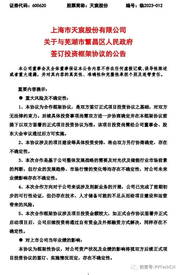 据了解,此次天宸股份并非首次宣布涉足光伏。早在去年2月,天宸股份便公告称,与华晟新能源拟按照80%:20%的股权比例,合资设立太阳能HJT异质结组件公司,共同开发和拓展太阳能HJT异质结组件及下游应用市场。