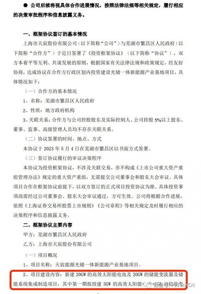 天宸股份在公告中表示,拟在安徽省芜湖市繁昌区投资建设光储一体新能源产业基地项目,计划总投资116亿元,其中固定资产投资不低于80亿元。