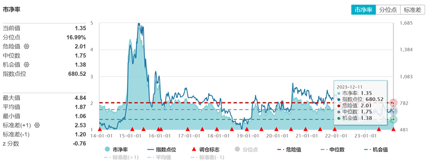 当前,券商板块正处于估值底部区间,截止12月11日,券商板块市净率仅为1.35,小于机会值1.38,比近10年84%左右的时间都要便宜。