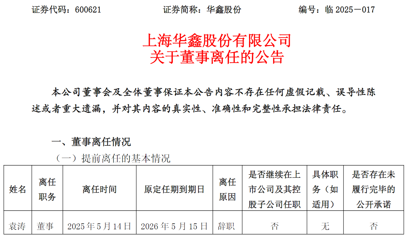 5月14日下午,华鑫股份公告称,公司董事会于2025年5月14日收到公司董事袁涛的辞职报告。袁涛因工作变动原因,提出辞去公司董事会董事职务。辞职后,袁涛不在公司及其控股子公司任职。