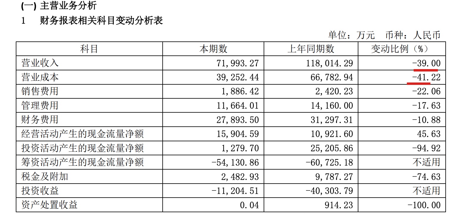报告期公司营业收入为71,993.27万元,与上年同期相比减少46,021.02万元,同比减少39%,主要原因是房地产开发业务本期结转商品房销售收入减少。报告期公司营业成本为39,252.44万元,与上年同期相比减少27,530.50万元,同比减少41%,主要原因是房地产开发业务本期结转商品房营业成本减少。报告期公司销售费用为,886.42元,与上年同期相比减少33.81元,同比减少22%,主要原因是并表基金朝天门项目本期销售面积减少,对应销售佣金减少。报告期公司财务费用为27,893.50万元,与上年同期相比减少3,403.81万元,主要原因是本期财务费用利息支出减少。报告期公司投资收益为-11,204.51万元,与上年同期相比增加29,099.28万元,主要原因是上年同期公司参股企业通过降价方式销售剩余存货,导致公司权益法核算长期股权投资确认的投资亏损金额较大。