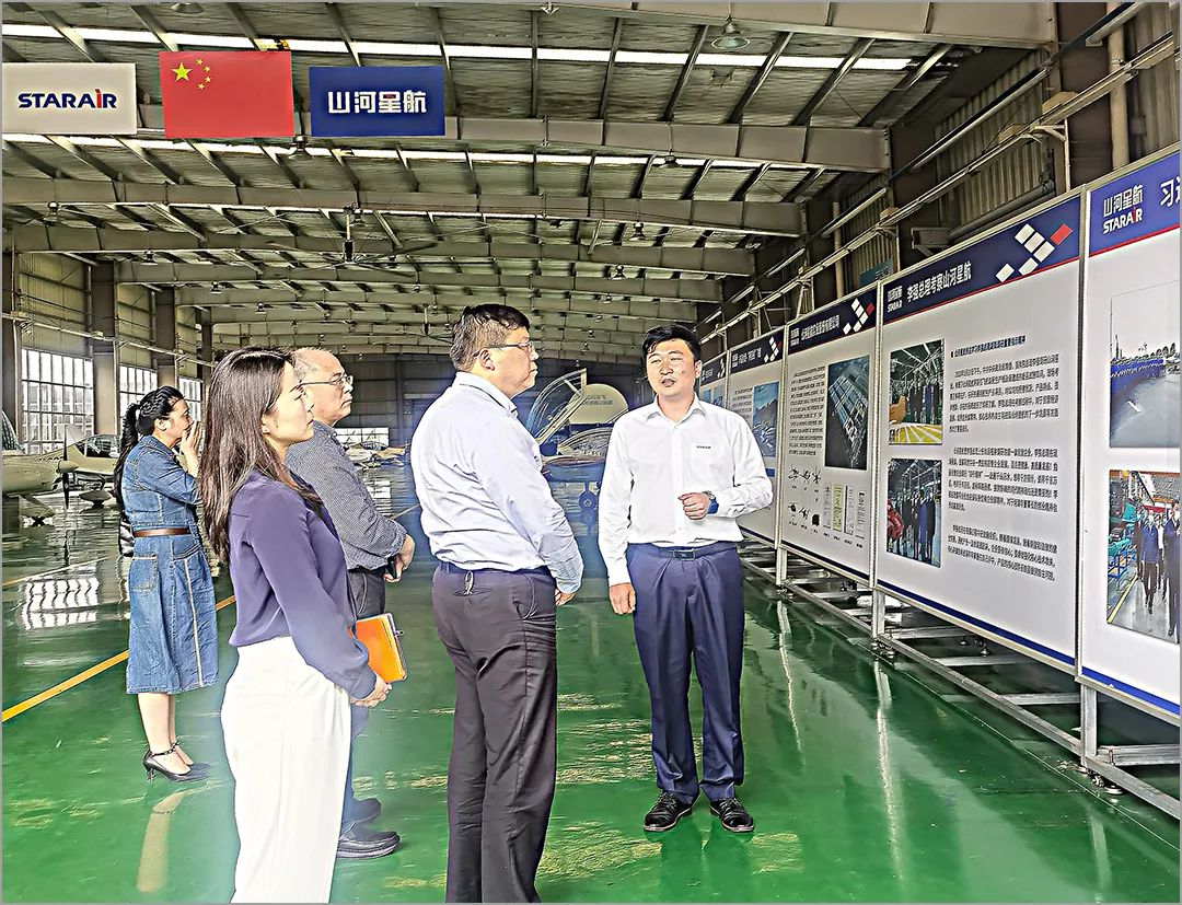 为了更直观地了解低空经济产业的发展情况,宋正董事长一行前往山河星航实业股份有限公司进行实地考察交流。山河星航实业股份有限公司是一家产、学、研相结合的高科技股份制公司,专业从事通用航空产品的研制、销售及服务。山河星航副总经理肖黄兴、市场部经理郑舒原全程接待并陪同大家参观公司生产基地和展示厅,了解企业的发展历程及产业规划和愿景。肖黄兴副总经理介绍,低空经济是以各种有人驾驶和无人驾驶航空器的各类低空飞行活动为牵引,辐射带动相关领域融合发展的综合性经济形态,作为新时代经济发展的新引擎,正逐渐展现出其巨大的潜力和广阔的前景,其既包括传统通用航空业态,又融合了以无人机为支撑的低空生产服务方式,与传统产业融合度高、带动性强,发展空间极为广阔。