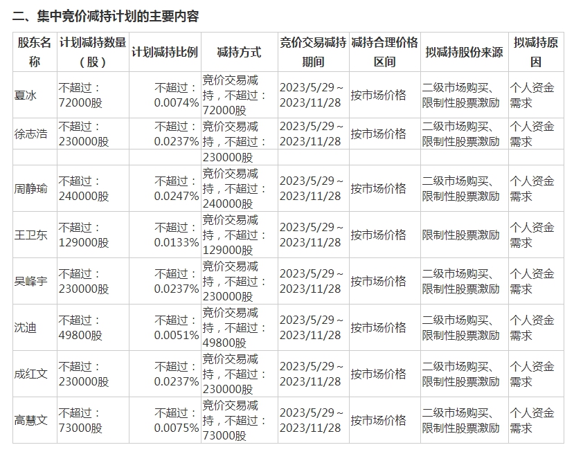 据披露,夏冰拟减持不超过72000股;徐志浩拟减持不超过230000股;周静瑜拟减持不超过240000股;王卫东拟减持不超过129000股;吴峰宇拟减持不超过230000股;沈迪拟减持不超过49800股;成红文拟减持不超过230000股;高慧文拟减持不超过73000股。减持方式均为竞价交易减持,原因均为个人资金需求。