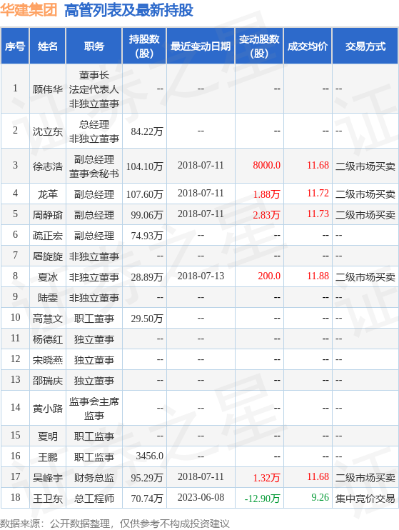 华建集团的高管列表及最新持股情况如下: